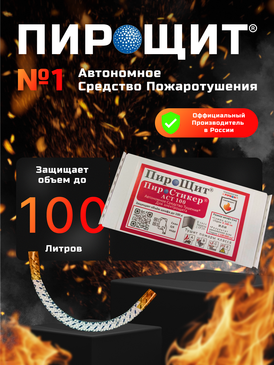 ПироЩит® ПироСтикер АСТ 100, Автономное Средство Тушения, технология FIPRON® (ФИПРОН). Автономно тушит пожар в электрощите объёмом до 100 литров. Размер электрощита, сумма всех сторон ≤ 140 см (Высота + Глубина + Ширина), IP20.
