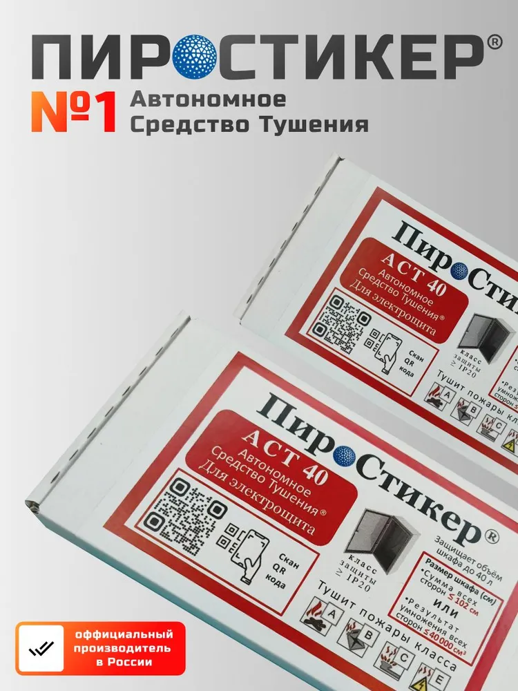 ПироЩит® ПироСтикер АСТ 40, Автономное Средство Тушения, технология FIPRON® (ФИПРОН). Автономно тушит пожар в электрощите объёмом до 40 литров. Размер электрощита, сумма всех сторон ≤ 102 см (Высота + Глубина + Ширина), IP20.